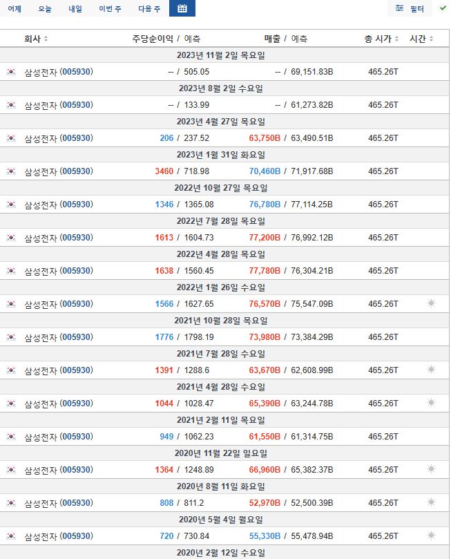 그러면 해당일정에 있는 모든 기업의 예상 발표날짜가 뜬다.